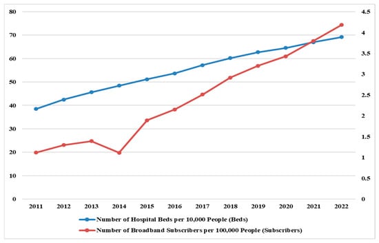 - Number of Broadband Subscribers per 100,000 People (Subscribers), as many studies have shown a higher level of informatization in urban areas compared to rural, with a pervasive “digital divide” existing globally [55,56]. This variable reflects the impact of urbanization in the fields of information and digital economy in China’s 31 provinces.