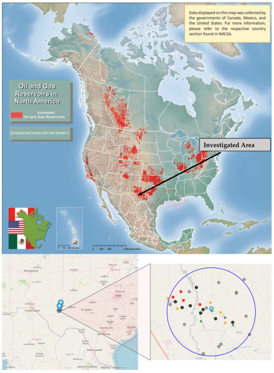 According to the U.S. Department of Energy (DOE), the number of depleted oil/gas reservoirs across the United States is over 11,000 and the actual estimation of the storage capacity of those fields is around 120–140 gigatons of CO2, which represents a significant opportunity for storage [31]. Figure 1 shows the distribution of those fields across the United States, highlighting the region of legacy wells that our investigation focuses on.