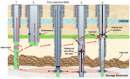 Plug placement in different wells with a risk of different leakage pathways being opened up. (1) A well with an open hole through the cap rock and injection zone with a plug placed above the cap rock resulting in leakage to upper formations and shallower wells; (2) a well not penetrating the cap rock near a leaky well; (3) a well with a plug left above the cap rock due to a fish lift in the well, raising concerns about leakage to upper formations; (4) a well that is plugged properly in the cap rock and storage reservoir and completed to produce from a sh. The crossflow from a defected well penetrating the injection zone provides a CO2 flow path to the surface.