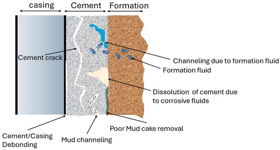 Debonding between cement and its surroundings, leading to micro-annulus formation, is primarily caused by insufficient mud removal during drilling, casing expansions and contractions during production or completion, and cement shrinkage during hydration and setting [90]. Leakage pathways may develop through gaps in the cement-casing, cement–formation interfaces, or cracks through the cement itself; see Figure 4. There are two types of cement pipe bonding: shear bonding and hydraulic bonding [91]. A shear bond provides mechanical support by resisting pipe movement, while a hydraulic bond prevents fluid migration by withstanding pressure until leakage occurs. Hydraulic bonding is key to isolating zones in wells, specially with regards to CO2 storage. Debonding is often caused by factors such as cyclic temperature and pressure changes, cement shrinkage and hardening, and fluid-driven debonding, leading to reduced oil and gas recovery and potential environmental pollution [26,92,93,94,95,96,97].