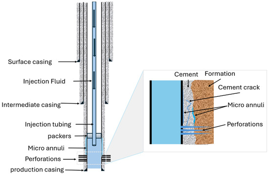 Cement interface debonding during wellbore operations is a serious issue often introduced by small defects from perforation or fluid injection processes; see Figure 5. These defects mainly occur at the casing–cement and cement–formation interfaces, caused by perforation explosion, which damages the cement structure [110]. As pressure builds up beyond what the cement sheath can withstand, the defects grow and begin to disseminate [111,112]. Furthermore, the process becomes more complicated with large pressure and temperature changes, which add stresses to the cement that are greater than the stresses increased by deformation and fracture [112,113]. It has been found that CCI and CFI interfaces can simultaneously experience debonding, especially during fluid injection. For instance, Lecampion et al. [113] built a model to predict the manner in which these cracks spread, while Jiang et al. [114] and Feng et al. [115] demonstrated which mechanisms would lead cracks to become more pronounced. Gu et al. [116] built a model for the simultaneous propagation of the fluid-driven debonding at both the casing–cement and cement–formation interfaces, assuming the presence of a competition between fractures at these two interfaces and fluid injection. Although leakage analysis results from Watson and Bachu [84] indicate that completion intervals do not affect cement integrity, cement debonding from perforation and fluid injection still threatens well integrity as defects propagate under pressure and temperature variations. More interpretation and understanding is required to understand the conflicting effects to better infer legacy wells’ integrity for CCS projects.