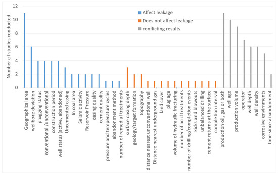 Ref. [132] visualized a bar chart, presented in Figure 6, showing case studies that discuss the effect of different factors affecting wellbore leakage. However, the concern is the factors that showed no effect on the leakage were backed up by no more than two case studies, suggesting the need for more investigations to confirm their effects. On the other hand, factors with conflicting results were supported by the highest number of case studies, suggesting that better interpretation needs to be performed for these factors. For example, in [133], the authors conducted a hazard analysis comparing wells of different categories based on their age. Despite the expectation that more recent wells (2009–2012) would show fewer issues due to advancements in materials, stricter regulations, and evolving industry practices adapted to local geology, the data revealed a different trend. In northeastern Pennsylvania, the violation rate for unconventional wells was slightly lower for those drilled between 2009 and 2012 (9.1%) compared to those drilled from 2000 to 2008 (9.8%). However, newer wells had fewer years of inspection. When comparing wells of the same age, the newer wells had more violations than the older ones, for both conventional and unconventional wells [133]. Geography can act as a key factor in well integrity, with wells in northeastern Pennsylvania being 8.5 times more likely to experience violations compared to other parts of the state, possibly due to complex geology and rapid drilling in areas with less drilling history.
