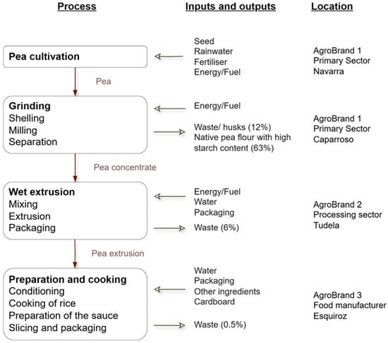 The production and processing of the product were carried out across several locations in the region of Navarra, Spain, reflecting a decentralized agri-food value chain. The product manufacturing process begins with pea cultivation in Cirauqui, followed by the milling process at Caparroso, which includes shelling, grinding, and separation to produce pea concentrate. The concentrate is then sent to Tudela for wet extrusion, involving mixing, extrusion, and packaging to form snacks. Finally, preparation and cooking take place in Esquiroz, including conditioning, the cooking of rice, the preparation of sauce, assembly, and the packaging of the final product. A description of the process, inputs, and outputs can be found in Figure 1.