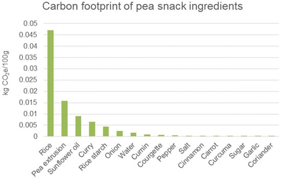 The carbon footprint analysis of the ingredients in the pea snack identified rice as the primary emitter of greenhouse gases, accounting for 53% of the total emissions associated with the ingredients. The second-largest contributor to the carbon footprint was the extruded pea, at 18%, highlighting waste management (crop residues are incorporated back into the soil) and fertilizer use as the main emission sources of the pea cultivation phase; this ingredient is followed by sunflower oil (10%) and curry (7%). Specific results per ingredient can be found in Figure 3. The detailed information regarding ingredients, origins, and factors utilized in the calculation of the carbon footprint is available in Supplementary Table S3.