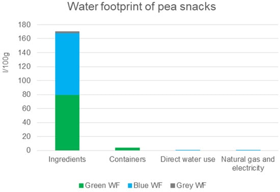 Green water footprint (green WF), blue water footprint (blue WF), and grey water footprint (grey WF) of pea snacks (l of water per 100 g of packaged product).