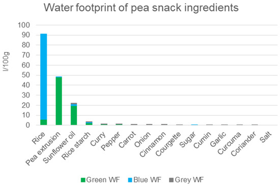 Among the ingredients of the pea snack, rice again emerged as the primary water consumer, accounting for 54% of the total water usage associated with the ingredients. It was followed by the extruded pea (28%) and sunflower oil (13%). Regarding the pea production analysed in Navarra, the water footprint is composed almost entirely of green water (150 L/100 g). Regarding nitrogen-related impacts, due to the high efficiency of nitrogen’s application in the pea cultivation system, the resulting grey water footprint is practically negligible according to the nitrogen balance assessment. Specific results per ingredient can be found in Figure 5. The detailed information regarding ingredients, origins, and factors utilized in the calculation of the water footprint is available in Supplementary Table S2.