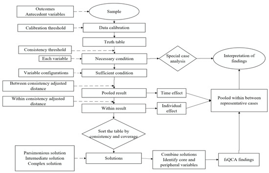 FCSE is affected by numerous factors; however, limited studies have used set theory and configuration perspective to analyze it. fsQCA is a set analysis method, holding that the impact of FCSE-influencing factors on FCSE is not independent, and its significance and role depend on its combination with other influencing factors. The analysis of this configuration is achieved through set analysis. The difference between set analysis and correlation analysis techniques lies in that it analyzes sets rather than variables [39]. Therefore, after determining the results and preconditions and setting the threshold, the meas-urement variables require calibration to allow the original measurement to have an interpretable set meaning and determine the membership degree. Therefore, the fuzzy set is established, then the truth table is constructed. Calibration refers to taking into account both the category and degree differences among the cases, so that the measurement can be interpreted and meaningful [40]. Moreover, the necessary and sufficient conditions for a set analysis should be examined, comprising testing whether FCSE (Y) is a subset of a condition or combined conditions (X) (Y ≤ X), and whether a condition or combined conditions constitute an FCSE subset (X ≤ Y), respectively. However, all of this predicates that the condition configuration consistency is higher than the acceptable empirical standard (0.75). In the consistency analysis, paying attention to the case configuration frequency is also necessary, a basic requirement being that the selected case frequency should retain at least 75% of the observed cases. Finally, the configuration should be summarized and organized for analysis. Figure 1 presents the specific steps.