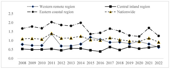 This study showed that economic development may be an important factor affecting forest carbon sinks [34]. In this study, 30 provinces (autonomous regions and municipalities) were divided into the eastern coastal region, the central inland region, and western remote region and analyzed.