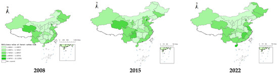 In terms of regions, the FCSE of other provinces (autonomous regions and municipalities) showed a steadily increasing trend, except for Tianjin and Hainan (Figure 4). Under extreme high-temperature stress, the photosynthetic activity of vegetation is reduced or even stagnant, and respiration is increased. The increase in respiration exceeds the reduction in vegetation productivity, thereby aggravating the decline in the ecosystem’s carbon sink function [55]. Climate warming increases the risk of forest diseases, pests, and fires, which is a notable stress factor for the carbon sink function of forest ecosystems and significantly weakens the capacity of forest carbon sinks [56]. The Tianjin explosion accident in 2015 resulted in local climate warming as well as the direct reduction of forest resources. Owing to the growth cycle of trees, it is challenging for Tianjin to act as a maximum carbon sink in a short period. Hainan, an ecological province, is the experimental field of national tourism reform, and the overall carbon sequestration capacity of forest ecosystems has been enhanced through three measures: afforestation of Treasure Island, the establishment of scientific and technological support for forest carbon sinks, and carbon sink trading. The increase in the afforestation area is a direct factor in improving the FCSE of Hainan.