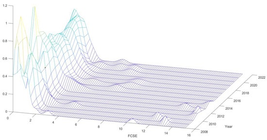 Formula (3) tests the spatial autocorrelation of China’s FCSE, with the results presented in Table 7. Table 7 indicates that most of Moran’s I index values for FCSE were negative, and from 2017 onwards, the index shifted to positive, indicating a transition from a negative to a positive correlation. No significant spatial autocorrelation was observed in FCSE, exhibiting discrete spatial patterns. This may be because both the carbon sink and carbon source influence the FCSE, and the connectivity direction or spillover size of the carbon sink and carbon source are inconsistent.