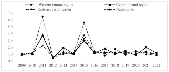 Formula (1) quantifies the FCSE through an environmentally extended productivity ratio that maximizes desirable outputs while minimizing undesirable outputs relative to resource inputs, as schematically represented in Figure 3. Figure 3 shows the time-series evolution of the FCSE. Overall, the national FCSE is basically greater than 1, showing the characteristics of “high and stable”, but regional differences are significant. During 2010–2011, the western remote region’s FCSE exhibited an upward trend, leading to an improvement in the national FCSE. This may be because China started a pilot reform of state-owned forest farms and state-owned forest areas and strengthened the cultivation of forest resources. State-owned forest areas are primarily located in the remote western region. After 2011, the FCSE in the western region experienced a brief decline, then gradually rebounded. Subsequently, it fluctuated within the normal range as the reform of state-owned forest farms and areas was still in the exploratory stage, with multiple superimposed problems such as the absence of systems, insufficient management capabilities, and limited experience. With the further reform work development, such problems have been improved, thereby driving FCSE recovery in the western region. The FCSE in the eastern coastal area is significantly higher than that in the central inland and western remote areas. A high level of economic development could bring about internal factor optimization such as forestry structure and external factors such as forestry technology, conducive to FCSE improvement. However, the central inland area is restricted by multiple natural geographical environments such as precipitation, temperature, soil, and altitude. The carbon sink function of forests remains limited.