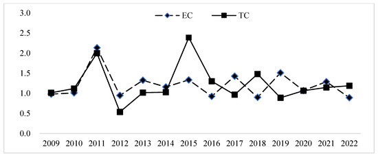 Formula (2) calculates the FCSE change index, with the results presented in Figure 7. Figure 7 shows that the change index of forest carbon sink efficiency was ˃1, indicating that the FCSE showed an overall growth trend. Except for 2011 and 2015, the trends in each region were relatively stable. The years 2011 and 2015 were in the policy-sensitive period after the end of the 11th Five-Year Plan and the imminent completion of the 12th Five-Year Plan. This indicates that institutional intervention can rapidly improve low-efficiency areas, but long-term capacity building needs to be accompanied. For further analysis, the Malmquist–Luenberger (ML) was decomposed into the efficiency change (EC) and technical change (TC), as shown in Figure 8 and Table 6. The mean value of the ML index was 1.04, the mean value of EC was 0.9, and the mean value of TC was 1.21. Technological progress leads to the improvement of FCSE, with TC being the main growth driver. However, EC has remained sluggish for a long time, reflecting the unsustainability of extensive management. The mean value of EC was lower than that of TC, indicating that technical efficiency was the main factor limiting the development of FCSE. The input–output efficiency of technology was not optimal, and there was technological progress or innovation. With the advancement of policy support and technological progress, the carbon sink potential of China’s urban agglomerations has continuously improved, and low-level areas have gradually decreased [59].