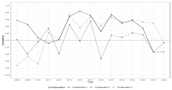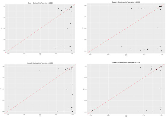 Further analysis of causal combinations with between consistency adjusted distance ˃ 0.2 was performed, as shown in the attached Table A1. The results showed that from 2008 to 2009, the consistency level between the Case 4 and Case 8 groups was 0.9%, with a coverage rate of 0.5; however, all failed the necessary condition test by the X-Y scatter plot test, as shown in Figure 9 [62].