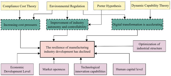 Within the neoclassical framework of environmental economics, environmental pollution is widely recognized as a typical negative externality, leading to inefficient resource allocation and social welfare losses. Environmental regulation seeks to internalize these external costs through institutional intervention [14], aiming to reconcile environmental protection with economic development. However, from the perspective of manufacturing resilience, such regulations may exert negative effects on system stability and adaptability via various cost-based mechanisms.