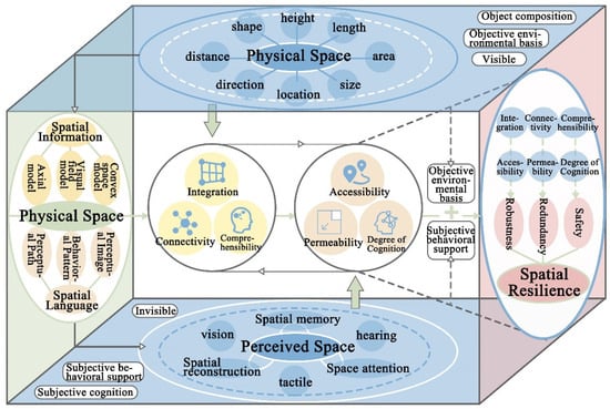 Physical space constitutes the objective environmental foundation of a city and serves as a fundamental pre-requisite for spatial resilience. However, in emergencies or crises, it is only the material spatial information perceived by individuals that can effectively contribute to resilience responses [26,27]. Perceived space serves as a crucial link between individuals and physical environments, encapsulating subjective interpretations while transforming tangible spatial in-formation into actionable insights. This process of translation greatly impacts individuals’ capacity to respond to risks. Within the framework of resilience planning for urban public spaces, space syntax provides valuable tools and methodological support for connecting material and perceived spaces. It empowers planners to comprehend the needs and expectations of space users, effectively pinpoint vulnerable areas within urban settings, and design urban spaces that prioritize human-centered approaches [28].