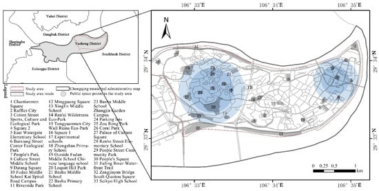 The concept of public space originates from sociology and political philosophy, and is gradually used in urban planning and design disciplines, but at present there is no unified and clear definition of it at home and abroad. Public space in the narrow sense refers to the outdoor space for public use by urban residents in their daily life and social life. It includes streets, squares, parks, sports venues and so on. The broad concept can be extended to the space of public facility land, such as city center area, commercial area, urban green space, etc. Public spaces that are open, accessible and available to the public can be used to achieve urban resilience. In this paper, urban public space refers to any outdoor space in a city that is completely open and accessible to the public, mainly including squares, parks, sports venues, etc. in cities. Based on the analysis of Points of Interest (POI) data, a total of 33 major public spaces on the Yuzhong Pen-insula were identified through a comparison of satellite images and supplementary field research. As illustrated in Figure 2, these existing public spaces are widely distributed across the Yuzhong Peninsula, with a notable concentration around the vicinity of 23# Bashu Middle School Zhangjia Garden Campus and 4# Square 2.
