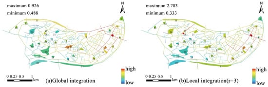 Analysis of global integration degree and local integration degree of public space in Yuzhong Peninsula.