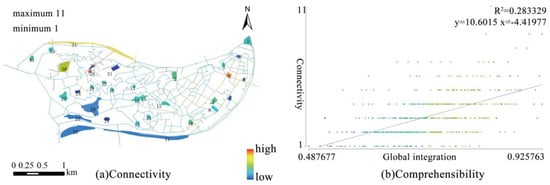 Comprehensibility was analyzed through an XY scatterplot, with global integration and connectivity selected as the two datasets for regression linear analysis in Depthmap software (Figure 4b). The X-axis represents the global integration of the Yuzhong Peninsula, while the Y-axis represents connectivity, with R2 indicating comprehensibility. The analysis results reveal that the intelligibility of the Yuzhong Peninsula is only 0.283, indicating a weak correlation between the local space and the global space of the peninsula. This suggests that people’s awareness of this space is low and that spatial safety is inadequate. Consequently, individuals’ spatial perception of the peninsula is poor, making it challenging to understand and navigate the space. This difficulty can lead to disorientation and spatial confusion during evacuation, ultimately resulting in insufficient psychological safety and adversely affecting the peninsula’s resilience.