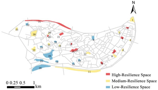 As shown in Table 3, the average levels of robustness and redundancy serve as benchmarks: values exceeding the average are classified as high resilience, while those below the average are categorized as low resilience. The comprehensibility parameter (R2) is also included, with R2 < 0.5 indicating low resilience. By incorporating the dimensions of robustness, redundancy, and safety, the resilience characteristics of public spaces in the study area can be systematically classified. A public space is deemed high resilience if all three indicators are high, or if two indicators are high and one is low. Conversely, the classification of ‘two lows and one high’ denotes medium resilience, while ‘all three lows’ indicates low resilience. The analysis reveals that 30.3% of the public spaces in the study area exhibit high resilience, enabling them to effectively meet the needs of residents across various scenarios. Public spaces with medium resilience make up 39.4%, which may show deficiencies in robustness or spatial redundancy, indicating a need for further optimization of their functional layout. Low-resilience public spaces comprise the remaining 30.3%, characterized by limited accessibility and safety, as well as poor overall adaptability and risk resistance. Overall, while high and medium resilience public spaces are predominant, the significant proportion of low-resilience spaces highlights the necessity for targeted interventions aimed at optimizing the layout and spatial configuration of public spaces in the Yuzhong Peninsula. Specifically, prioritizing improvements in low-resilience spaces is essential for achieving a comprehensive enhancement in the resilience of urban public spaces.