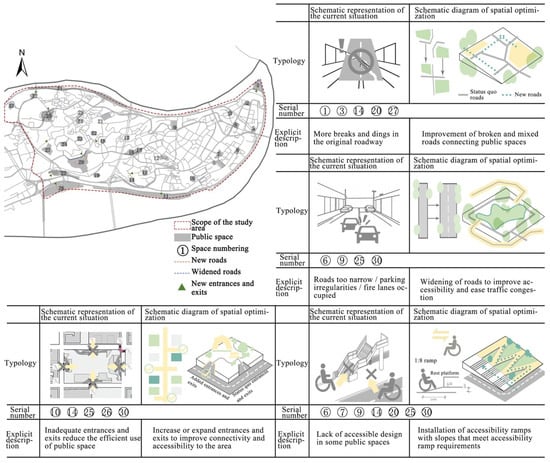 Enhancing the accessibility of public spaces facilitates easy access for individuals to neighboring areas in response to disturbances and ensures the smooth arrival of rescue personnel and materials. A sustainable and robust physical environment is crucial for reinforcing the resilience of public spaces, serving both as a guarantee for the life and health of the population and as a foundation for emergency rescue operations. Analysis of global and local integration indicates that the accessibility of public spaces on the east side of Yuzhong Pen-insula is high, while that on the south and west sides is relatively low, resulting in a diminished capacity for gathering and evacuating individuals. It is recommended to strengthen construction of the road network on the peninsula, organize mixed-use roads, and open interrupted and winding routes. Additionally, improving the barrier-free design of public spaces will enhance convenience and accessibility for the public. As illustrated in Figure 6, it is advisable to increase the connectivity between 20# Loquat Hill Park and the adjacent roads to improve road accessibility; appropriately widen the road connecting 25# Zou Rong Park and 30# People’s Square, increase the number of entrances and exits, and install accessible ramps to ensure that individuals can quickly enter public spaces for refuge during emergencies.