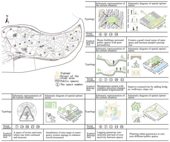 The comprehensibility of the Yuzhong Peninsula is currently low, and the correlation between connectivity and integration is weak. Consequently, the public’s perception of the spatial system within the Peninsula is diminished due to its geographical location, which adversely affects the resilience of each public space. The mountainous terrain further complicates this issue, as the roads connecting public spaces are often winding or sloped. This irregularity disrupts individuals’ perception of the space, leading to feelings of confusion and insecurity. To address these challenges, it is recommended to plan and construct a street network characterized by a clear hierarchy, simple forms, and complete shapes that provide directionality. For public spaces situated in areas with dense road networks and poor navigational clarity, such as 26# Coral Park and 7# People’s Park, the installation of area maps or emergency signage is advisable. This would enhance visual permeability and ensure spatial accessibility, thereby improving overall spatial comprehensibility (Figure 7). By leveraging the mountainous terrain, it is possible to foster a strong sense of spatial visualization, allowing the public to develop a distinct and effective perception of urban public spaces.