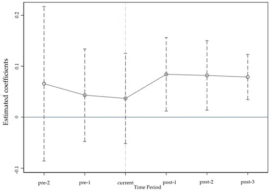 The analysis based on the DID method relies on the premise that there are no systematic disparities between the treatment and control groups before the policy intervention. This implies that there are no statistically significant variations in AGTFP prior to CETS implementation. To further validate the baseline findings [76,77], we employ an event study methodology and construct a dynamic model. In this reassessment, the year prior to the implementation of CETSs is designated as the reference group. Figure 1 illustrates the estimated coefficients for the primary interaction terms, accompanied by their corresponding 95% confidence intervals.
