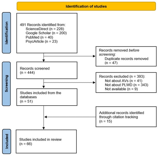 The initial search yielded 491 articles across all the databases. After removing 47 duplicates, 367 records were excluded based on title and abstract screening. Additionally, 28 full-text articles were excluded for not meeting the eligibility criteria. Ultimately, 51 articles were included in the core review. An additional 15 articles were identified through citation tracking. A total of 66 articles were included in the present review of the literature (see Figure 1). The comprehensive results are presented and summarized in Table A1.