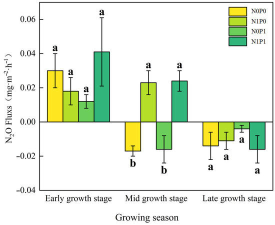 N2O Flux at different growth stages. Note: N0P0, N1P0, N0P1, and N1P1 represent the control, nitrogen addition, phosphorus addition, and combined nitrogen–phosphorus addition treatments, respectively. Lowercase letters atop the bar chart denote significant differences between treatments (LSD, p < 0.05). Error bars indicate standard errors (n = 4).