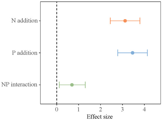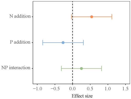 The interactive effects between N and P addition were thus classified into three types: additive, synergistic and antagonistic. If the 95% confidence interval (CI) overlapped with zero, the interactive effect was additive. If the individual effect sizes were both negative or one negative and the other positive, the interactive effect size was negative for synergistic and positive for antagonistic. In cases where the individual effect sizes were both positive, the interactive effect was greater than zero for synergistic and less than zero for antagonistic [31].
