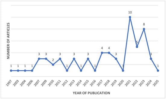 The process of selecting primary studies was anchored on well-defined inclusion and exclusion criteria (see Table 1). For inclusion, we focused on peer-reviewed studies that directly related to the reuse and certification of second-hand electronic products, especially those offering valuable information, artifacts, or techniques considered essential for certification. We concentrated our efforts on publications written in English to maintain consistency and clarity in our review. The literature search was conducted without a specified time period. This approach was taken to ensure a comprehensive collection of studies, capturing the entire spectrum of research on this topic, regardless of the publication date. In addition to these peer-reviewed articles, a limited number of gray literature sources were included based on their relevance and credibility, as recommended by domain experts. The earliest relevant studies began appearing in 1997, with a noticeable increase in publications peaking around 2021 (see Figure 2). The search concluded in March 2025.