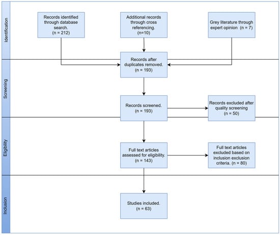 We targeted peer-reviewed journals and conference proceedings for their credibility and relevance. After identifying relevant studies, we extracted data focusing on certification criteria, benefits, challenges, and best practices in product reuse. This data was then systematically analyzed to identify common themes and divergences in the existing literature. The search in Scopus and Google Scholar led to the identification of 212 entries. To supplement this dataset, 10 additional records were included through cross-referencing [], and 7 gray literature sources were added based on expert recommendations. A total of 193 articles remained after excluding duplicates. To ensure a wide information base, scientific articles published in peer-reviewed journals, industry reports, conference papers, and gray literature were included for the screening step. This selection was based on the high standards of peer review and credibility, ensuring reliance on high-quality scientific research. Thus, 50 articles were excluded and the remaining 143 articles were screened by reading the title and the abstract. Articles not fitting the objective of this research were excluded. The eligibility criteria were defined as follows: only studies addressing components under the reuse umbrella concept and subsequent certification and standardization process were included. A final set of 63 papers have been considered for this analysis (Refer to Appendix A). Figure 3 elaborates the systematic review PRISMA flow diagram. (See details in Supplementary Materials).