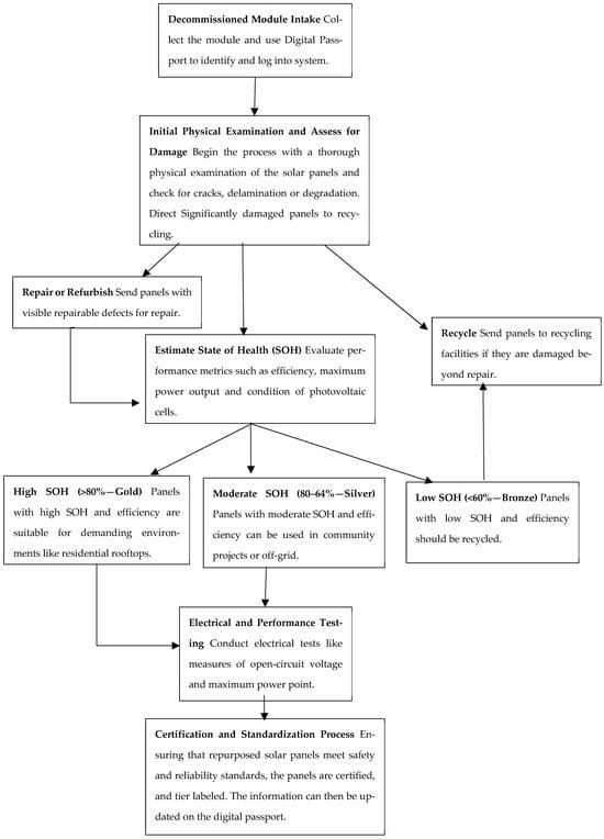 The fourth step involved in repurposing solar panels is the certification and standardization process. Just as with batteries, repurposed solar panels must meet certain industry standards to ensure they are safe and reliable for use []. By establishing structured acceptance and rejection criteria, this framework reduces inconsistencies in panel assessment and provides a scalable solution for the secondary PV market. This certification process builds consumer trust and is crucial for the broader acceptance and integration of repurposed solar panels into the market.