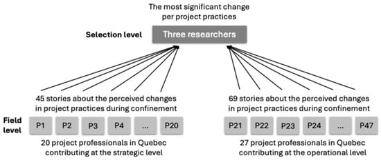 The most significant change (MSC) method is a participatory approach to monitoring and evaluation that emphasizes the collection and analysis of qualitative data to assess the long-term impacts of programs and projects []. Originally developed by Davies and Dart [] to evaluate international development initiatives in Bangladesh and grounded in a interpretivism paradigm [], MSC has since been applied in a variety of organizational, community, and institutional contexts. It offers a way to capture significant changes as perceived by individuals at all levels affected by a project or program. This technique offers a valuable perspective for examining how project managers and their teams adapted during the pandemic. MSC assess what individuals experienced as a direct result of a specific context or event—in this case, the pandemic []. This method is particularly suited to this study because it reveals the nuanced and often unexpected transformation that project managers and teams underwent, such as alterations in their workflows, leadership approaches, and even organizational cultures, all of which might be overlooked by quantitative standardized analysis. It encourages participants to reflect deeply on their most meaningful changes, enabling a rich understanding of how their practices and perceptions evolved throughout the crisis.