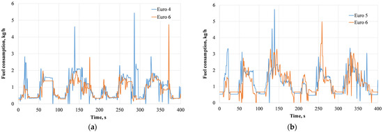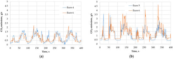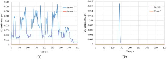 A contrasting situation is observed when analyzing the CO emissions of gasoline vehicles (Figure 2b). In this case, both vehicles exhibit near-zero CO emissions throughout the driving cycle, with the exception of a single peak from the 2014 Nissan Qashqai (Euro 5), which recorded a value of 0.017 g/s during the third, most intense acceleration phase. It is assumed that the engine control unit temporarily enriched the air–fuel mixture during this acceleration to provide additional power [43,44,45] or to initiate the regeneration of a NOx storage catalyst [46,47]. However, this emission peak was observed only during the first cycle repetition; during the second run, CO emissions remained close to zero throughout. This suggests that the initial emission may also be attributed to the insufficient warm-up of the three-way catalytic converter (TWC), which had not yet reached full operating efficiency [48,49].