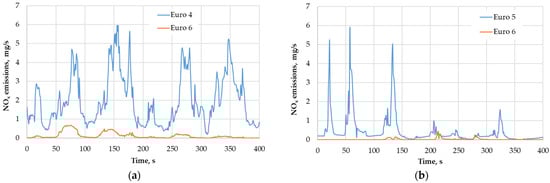 At first glance, gasoline vehicles (Figure 3b) appear to exhibit a clear advantage in terms of HC emissions compared to diesel vehicles (Figure 3a). However, closer inspection reveals that both Euro 6-compliant vehicles demonstrate similarly low HC emissions, typically fluctuating within the 0–0.025 g/s range, with the exception of the gasoline-powered VW Passat, which shows a noticeable increase between 60 and 80 s, peaking at 0.08 g/s. This can be attributed to insufficient warm-up of the three-way catalytic converter and the fact that different pollutants require different converter temperatures for effective treatment. Early-stage DOCs are particularly sensitive to their light-off temperature; if the exhaust gas temperature is too low or too high—or if the catalyst is contaminated—oxidation efficiency drops significantly [50]. The DOC also facilitates the conversion of NO to NO2 in the exhaust, which supports passive DPF regeneration and enhances SCR efficiency [51,52]. Thus, the DOC plays a central role in the performance of the entire after-treatment system and remains critical even in Euro 6-compliant vehicles [53].