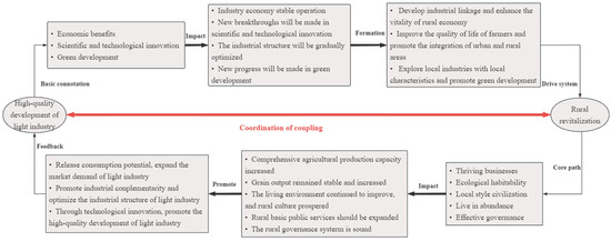 Third, it relies on technological innovation to push the light industry towards a phase of high-quality development. Guided by the rural revitalization strategy, the industries in townships and villages are undergoing rapid development, trending towards diversification and modernization. The consumer market within the light industry is continuously expanding, accompanied by ongoing optimization of the industrial structure, which collectively contributes to the increasing overall strength of the light industry. Light industry enterprises possess greater capital resources to invest in scientific and technological advancements. They consistently innovate their products, facilitate the processes of transformation and upgrading, and advance the light industry towards a high-quality stage characterized by innovation, coordination, sustainability, openness, and inclusiveness. Based on this, the theoretical framework of coupled coordination of high-quality development of China’s light industry and rural revitalization is obtained (Figure 1).