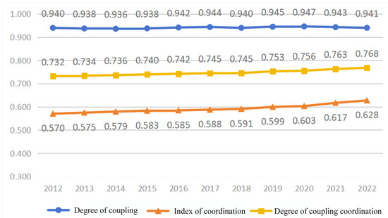 Figure 2 shows the degree of correlation between China’s good growth in the light industry and rural rejuvenation from 2012 to 2022, which is >0.9, suggesting a highly connected state. This implies that there is a clear reciprocal relationship between the growth of the light industry at a high level and rural rejuvenation. A clear relationship exists between mutual restrictions and mutual influence. Simultaneously, the coordination index for the quality development of the light industry and rural revitalization exhibited an increasing trend year-on-year, from 0.570 in 2012 to 0.628 in 2022, a relative increase of 10.18%. This suggests that light industry and rural revival are developing at a higher overall quality level. Finally, the degree of coordination between the high-quality development of the light industry and the revitalization of rural areas has increased from 0.732 in 2012 to 0.768 in 2022, a relative increase of 4.91%. In accordance with the grade classification of the degree of coupling coordination, the coupling coordination degree of the two systems remained within this range throughout the period of study. The coupling coordination level was classified as eight, indicating an intermediate coordination type, and demonstrated a positive development trend. Accompanied by the implementation of the rural revitalization strategy starting in 2017, as well as the corresponding introduction of a series of national policies to promote the high-quality development of the light industry, the development of China’s light industry has also entered a new stage, and the trend of the coupling and coordination of the two has been accelerated.