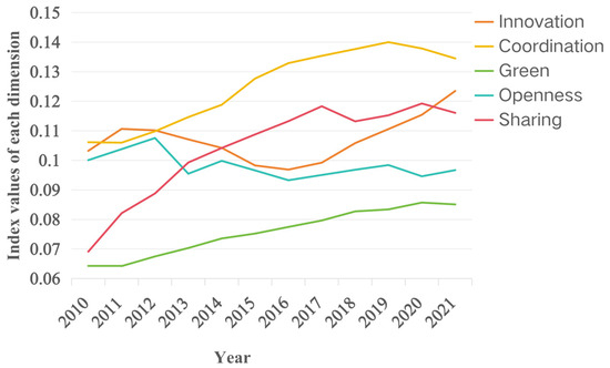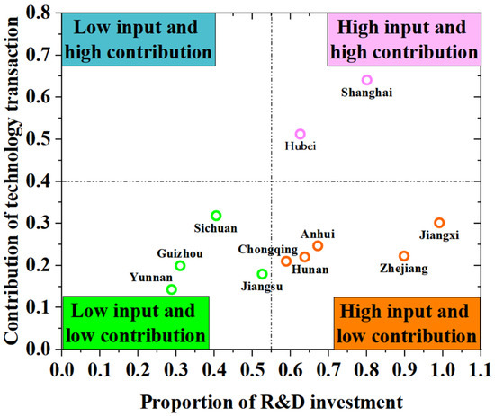 - Contribution of scientific and technological innovation to economic growth: In the dimension of innovation, Shanghai and Hubei exhibit high levels of scientific and technological investment and innovation contribution. Conversely, Chongqing, Hunan, Anhui, Zhejiang, and Jiangsu have high technological investment but relatively low innovation contribution. Yunnan, Guizhou, Sichuan, and Jiangxi show low input and low contribution, with Yunnan’s situation possibly related to its economic positioning and development stage.