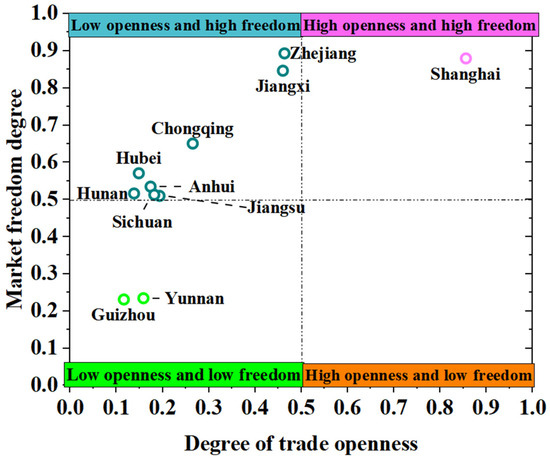 - Trade openness and market freedom: Shanghai excels in trade openness and market freedom, whereas Guizhou and Yunnan lag behind in these indicators. Most provinces and cities boast high market freedom but insufficient trade openness, with Zhejiang and Jiangsu being notable exceptions in terms of trade openness.