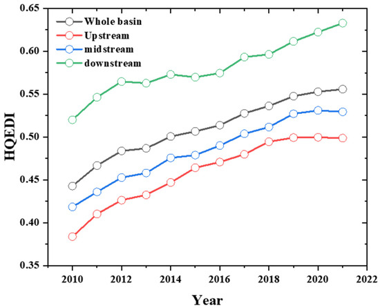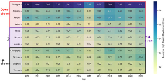 - The YEB (YREB) demonstrates a development pattern of “strong in the east and weak in the west.” The lower reaches, such as Shanghai and Jiangsu, have higher economic development levels. Upstream regions like Sichuan and Chongqing are relatively underdeveloped, while midstream regions such as Hubei and Hunan are intermediate. Overall, HQEDI shows an increasing trend. The average value in downstream regions is higher but grows more slowly, while upstream regions have a faster growth rate.