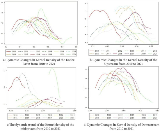 - Dynamic characteristics of the kernel density of high-quality economic development: The kernel density curve of the HQEDI in the YEB shifts rightward over time, reflecting improvements in high-quality economic development. However, differences among river basins are evident. The absolute difference in the HQEDI in the upstream region has gradually expanded, showing significant dynamic changes initially and then a steady increase in regional variation. The middle region, after rapid development, currently faces the challenge of increasing absolute differences. The downstream regions continue to improve in high-quality economic development but exhibit strong volatility, with bimodal or trimodal distributions, especially in recent years, indicating a trend of increasing disparity.