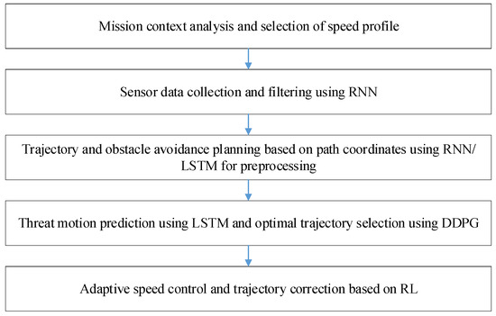 At the first stage, the mission objective (e.g., monitoring, reconnaissance, cargo delivery, or hybrid task) is analyzed to determine avoidance priorities. Based on the selected objective, a motion profile is formed. Then, an AI-based algorithm selects an appropriate speed profile, prioritizing either safety or efficiency. Depending on the mission goal, obstacle avoidance parameters are defined, such as sensitivity to obstacles, allowable course deviation, and speed thresholds. A reinforcement learning (RL) module tunes the avoidance parameters based on mission complexity and environmental conditions.