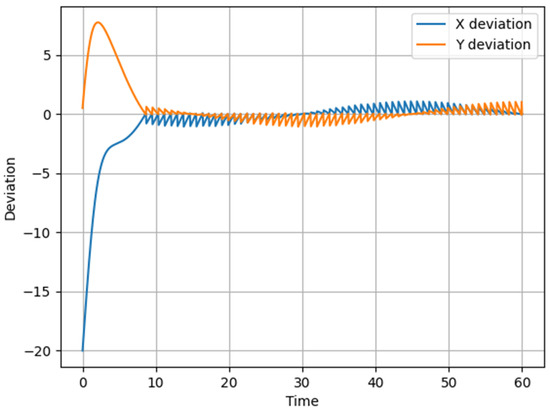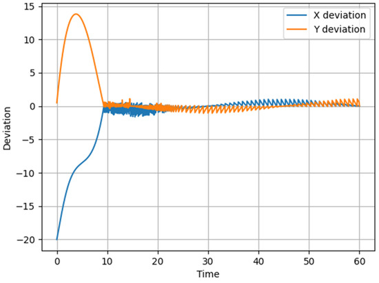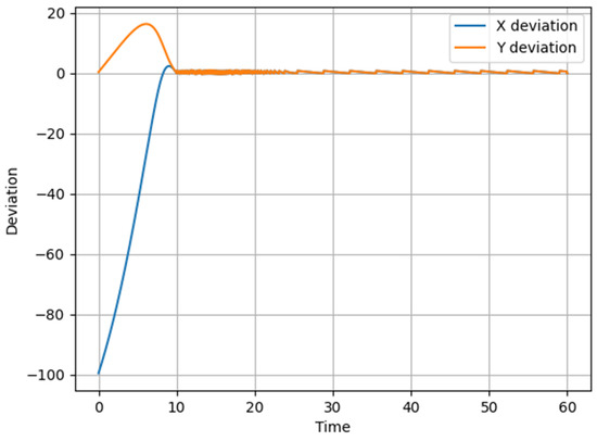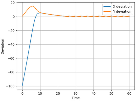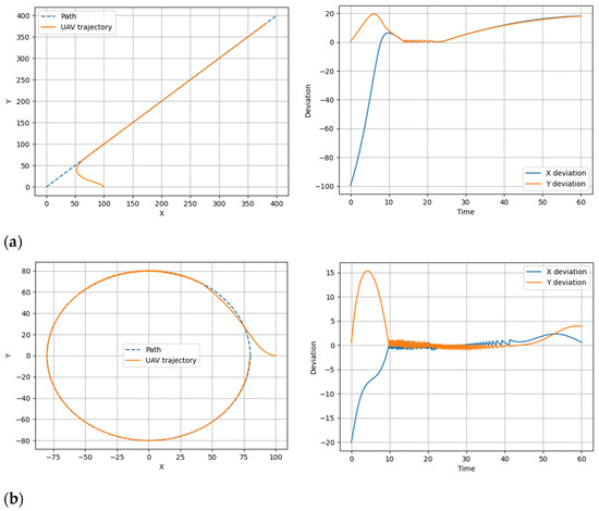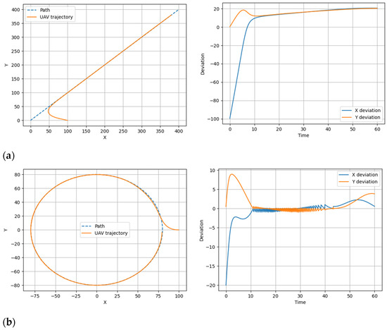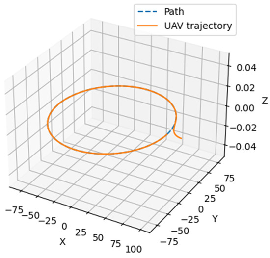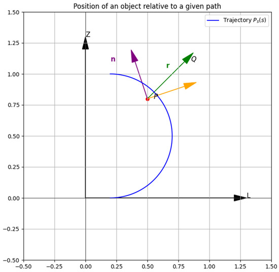 Trajectory tracking under limited information is essentially an intelligent control problem, where UAV position must be stabilized relative to the path using adaptive algorithms that account for incomplete or inaccurate sensor inputs. The use of path coordinates enables the real-time estimation of trajectory deviation, which is critical for rapid course correction. These coordinates represent state variables that describe the UAV’s position relative to a target point on the path. For bidirectional control, the system can select the nearest target point to the UAV’s current position. This approach is especially effective in two-dimensional spaces, where deviations can be expressed in two parameters. In three-dimensional environments, the concept of path coordinates is also applicable, although it requires more complex stabilization algorithms.