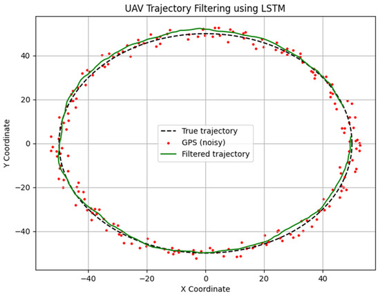 The true trajectory shows the theoretically correct path the UAV was supposed to follow. The GPS measurement points show noisy data obtained from the Global Positioning System (GPS), clearly displaying significant deviations due to satellite signal errors. The filtered trajectory is the result of processing the noisy GPS data using an LSTM neural network.