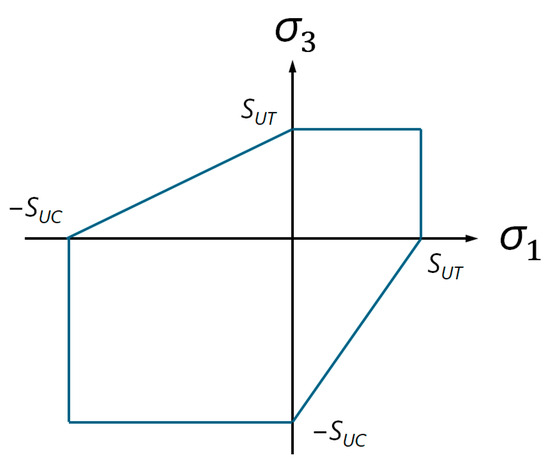 For the failure analysis, the safety factor (Fsafety) was calculated based on the Mohr–Coulomb criterion (Figure 1), which was chosen over the von Mises criterion due to its more accurate representation of concrete’s asymmetric behavior in tension and compression. This criterion is defined by Equation (2).