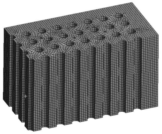 Adding fluid flow channels increases stress levels, which depend on the material properties, load conditions, and brick design. Therefore, it is necessary to use a material with higher compression strength. Manufacturing constraints were considered for the next steps, and the maximum number of fluid flow channels (each with a 6 mm diameter) was added. Static FEA will then be conducted to verify the maximum stress under load, and based on these results, the minimum required strength of the replacement material will be determined.