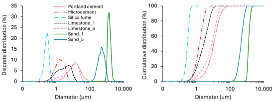 OPC and LF5 had similar D50 values, though OPC showed a narrower distribution. Microcement exhibited a smaller size range, indicating better packing potential. Silica fume, with D50 below 0.3 μm and high SSA, enhances packing and nucleation during hydration [26,27,28].