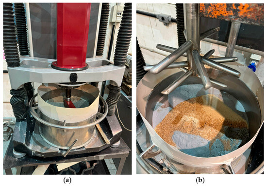 Initially, the dry materials (cement, silica fume, limestone filler, and sand) were added to the mixing vessel of the rheometer (Figure 6b). The dry mixing was carried out at a speed of 100 rpm for 180 s, ensuring the homogenization of the components before adding water. After this step, the water was added gradually at a flow rate of 50 g/s, using a funnel equipped with a rubber hose and a control valve.