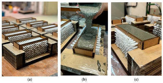 The blocks were produced using the molding technique, which is suitable for the type of UHPC mixture. The samples were molded (Figure 7a) in reinforced cardboard molds, laser-cut (200 × 100 × 60mm), designed to meet the shape requirements and ensure the proper positioning of the channels. To prevent water absorption by the cardboard and facilitate demolding, the molds were coated with adhesive tape, which acted as both a release agent and a barrier against water ingress. As defined in the methodology, 6mm plastic tubes were positioned to create the pre-existing channels in the piece. After mixing the concrete, the specimens were cast (Figure 7b,c) and kept in a dry chamber for 24 h, under controlled conditions of 23 °C and 50% relative humidity. After this period, the blocks were carefully demolded, and the plastic straws used to form the channels were manually removed, ensuring the proper opening of the flow ducts. Given the surface characteristics of UHPC, the removal of the plastic straws was greatly facilitated, leaving no material inside the openings or any residual debris. Subsequently, the specimens were placed in a moist curing chamber at a constant temperature of 23 °C and 100% relative humidity, where they remained for 28 days, completing the curing cycle according to the parameters recommended for concrete mechanical strength testing. Some specimens, however, were removed after 7 days for intermediate testing purposes.
