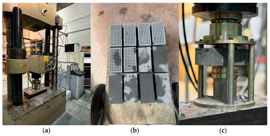A compressive load was applied to achieve the minimum specified 28-day compressive strength (fpk) of 35 MPa, as prescribed by ABNT NBR 9781:2013 [22]. The loading protocol followed a quasistatic analysis to maintain consistency with the normative loading rate requirement of 550 kPa/s, to simulate standardized testing conditions.